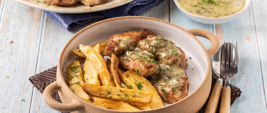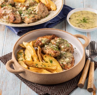 Σερβίρουμε το Κερκυραϊκό σοφρίτο με πατάτες τηγανητές.